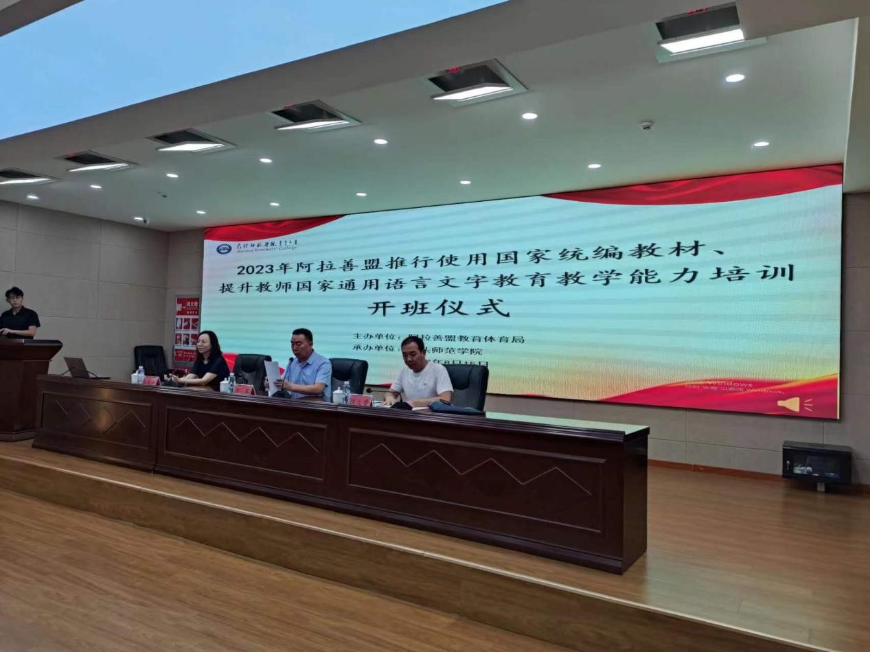 受阿拉善盟教育体育局委托,由我校承办的2023年阿拉善盟原民族语言授课学校义务教育段推行使用国家统编教材、提升教师国家通用语言文字教育教学能力培训于8月15日至8月17日举行。阿拉善盟教育教学研究中心副主任陈大贵、我校继续教育学院院长许军出席了开班仪式。