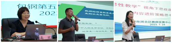 内蒙古自治区特级教师高欣、包头市教育教学研究中心思政课教研员索海旺、天津市河北区教师发展中心思政学科教研员刘秀珍分别进行了《一体化视域下的课堂教学》《新课标引领新航标寻“道”觅“法”探新路》《“反思性教学”视角下思政课一体化建设的内容进阶策略思考》的教法指导,让老师们在学习、思考中探究“教师到底怎么教,学生究竟如何学”,如何结合本学段的教学特色去合理、灵活地进行讲授,争取让课堂变得更加优质而高效。