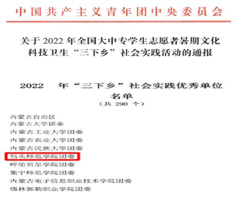 2022年,我校被评为全国暑期“三下乡”社会实践优秀单位;我校志愿服务工作获自治区“优秀组织单位”荣誉称号,校团委书记在自治区实践育人表彰大会上作典型发言。2023年,我校1支重点服务团队获评“三下乡”社会实践活动之乡村振兴“笃行计划”专项行动全国示范队。