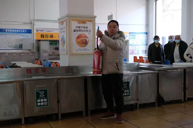 保卫处高峰老师为食堂全体从业人员示范了消防器材的正确使用。发生火灾事件时,所有人应该保持冷静和镇定,在逃生过程中用湿毛巾捂住口鼻,根据安全疏散指示灯提示,前往逃生出口,保持镇静、切勿拥挤,把握住最佳的逃生时机。