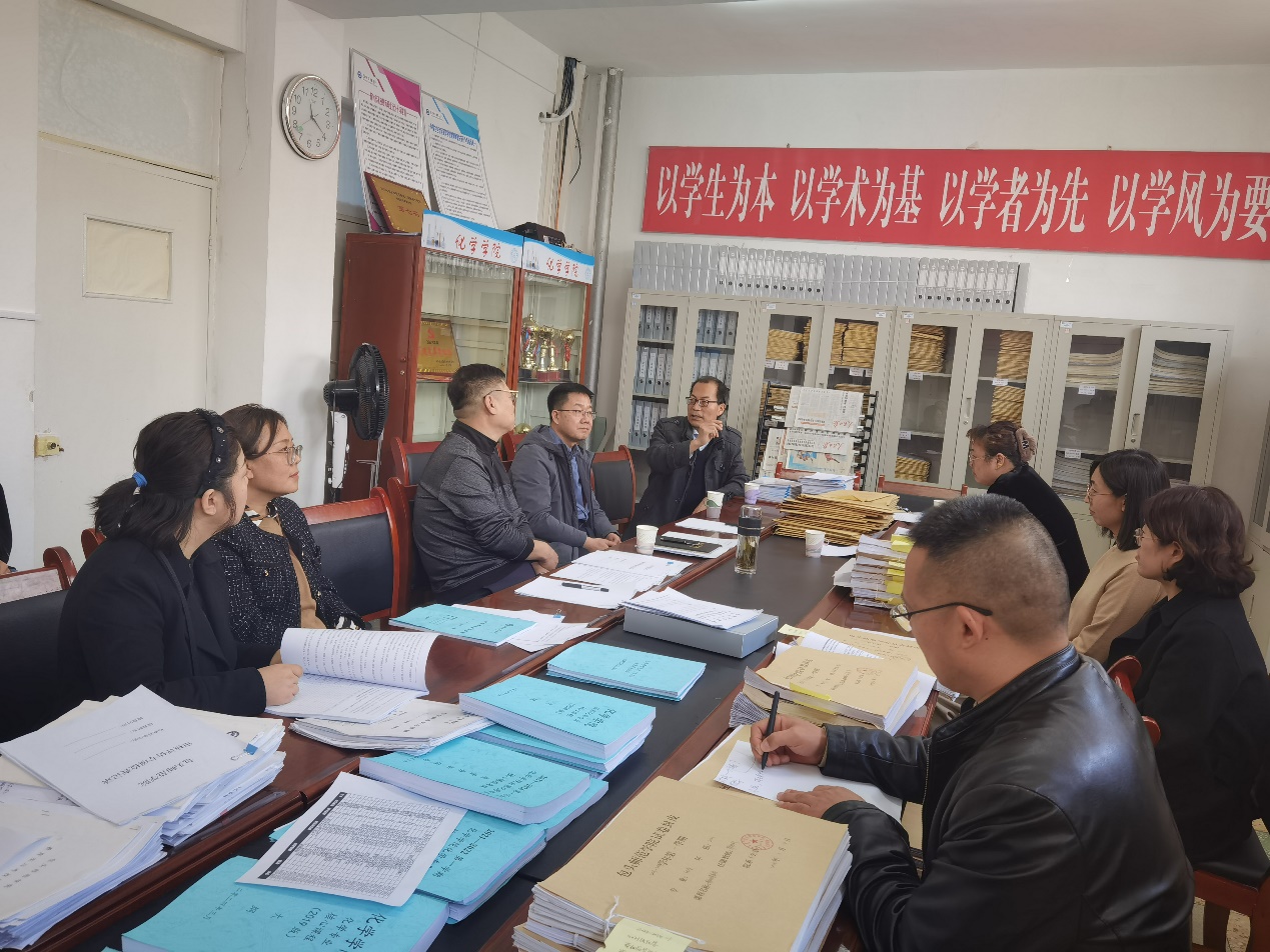 为进一步推进本科教育教学审核评估和师范专业认证工作,3月15日上午,我校党委委员、副校长马占飞教授、化学学院联系校领导党委委员、纪委书记刘醒君带队,胡利军组长及数学学院领导、督导、系部主任、课程组负责人等一行12人莅临化学学院检查指导审核评估、师范专业认证准备情况及教学档案材料,化学学院领导班子、系部室主任参会。