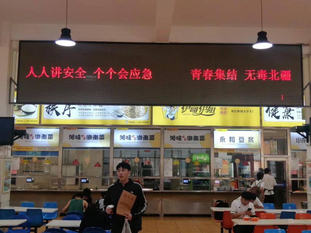 利用我校LED大屏幕,在博学楼广场、九原校区教学楼、食堂等人群聚集场所,开展不同形式的禁毒宣传工作。
