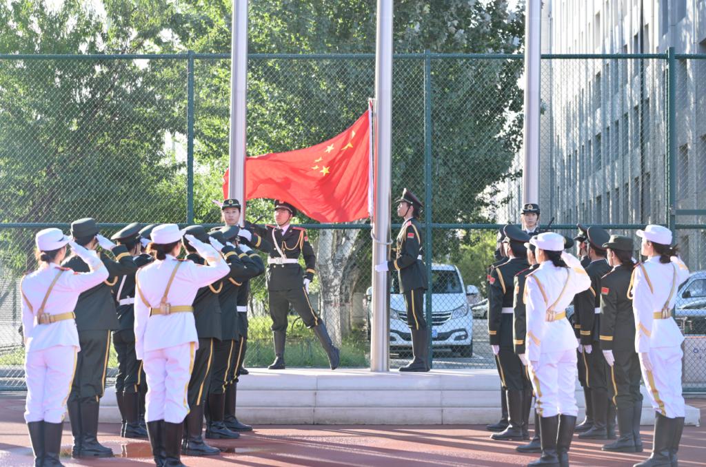 清晨时分,国旗护卫队迈着铿锵有力的步伐,庄严地护卫国旗入场。国旗伴着国歌冉冉上升,全体师生肃立行注目礼、高唱国歌。