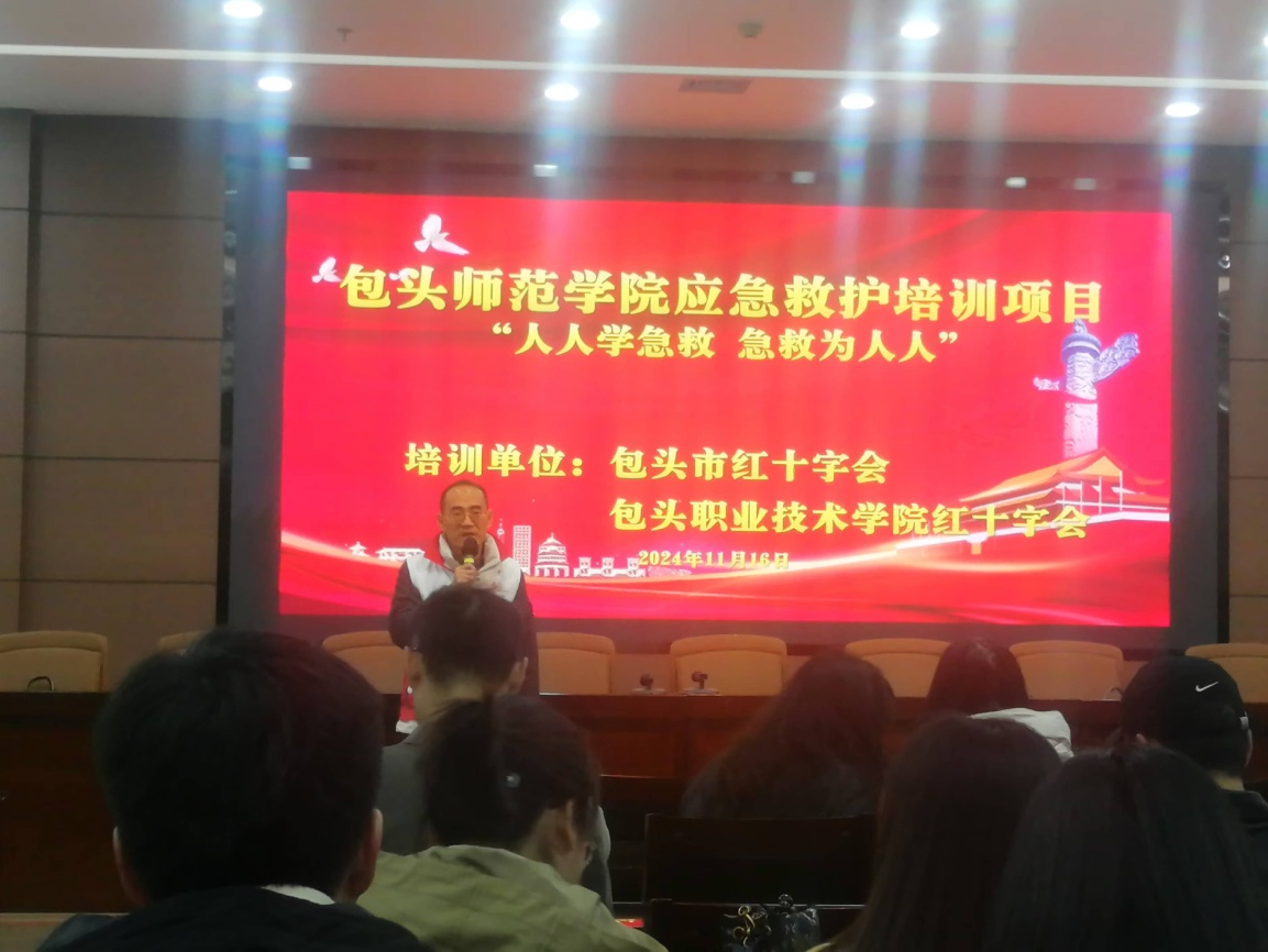 开班仪式后,我校邀请包头职业技术学院安全保卫部部长、红十字会副会长、秘书长、应急救护师邹庆华以“人人学急救、急救为人人”为主题做了应急救护专项培训报告。报告中讲解了红十字会的起源、职责与成立意义,明确了急救对于保护自己和他人的重要性、必要性;让大家初步掌握了对气道异物梗阻、创伤、心脏骤停等急救相关的理论知识,如何展开自救和互救的必要知识与重要方法,了解不同部位伤口的包扎材料和使用方法,明确了面对突发状况首先保持冷静的心理状态以便迅速开展救援行动。