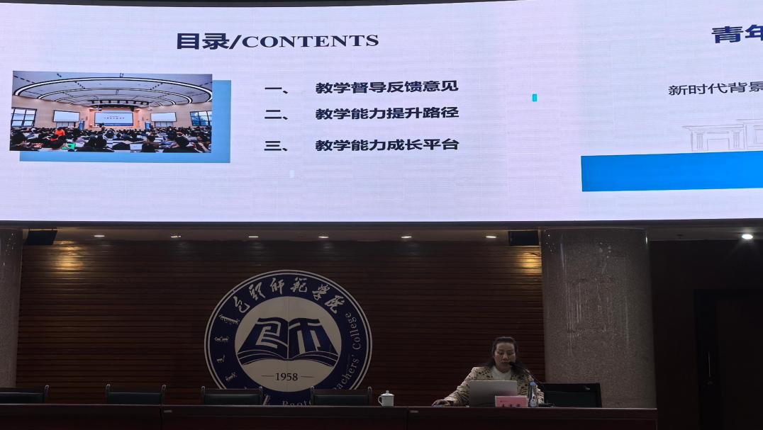 王宗霞教授以“新时代背景下青年教师教学能力提升路径与方法”为题作专题讲座,她结合高等教育教学发展趋势与自身多年教学实践经验,系统梳理了青年教师教学现状、教学内容设计的逻辑框架、“以学生为中心”的教学方式、科学有效的课程考核评价等核心内容,同时王教授结合自身成长经历,鼓励青年教师以教学比赛为成长平台,在实践中不断提高自身教学能力。