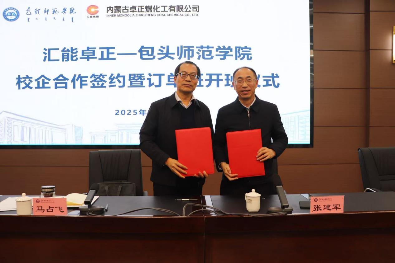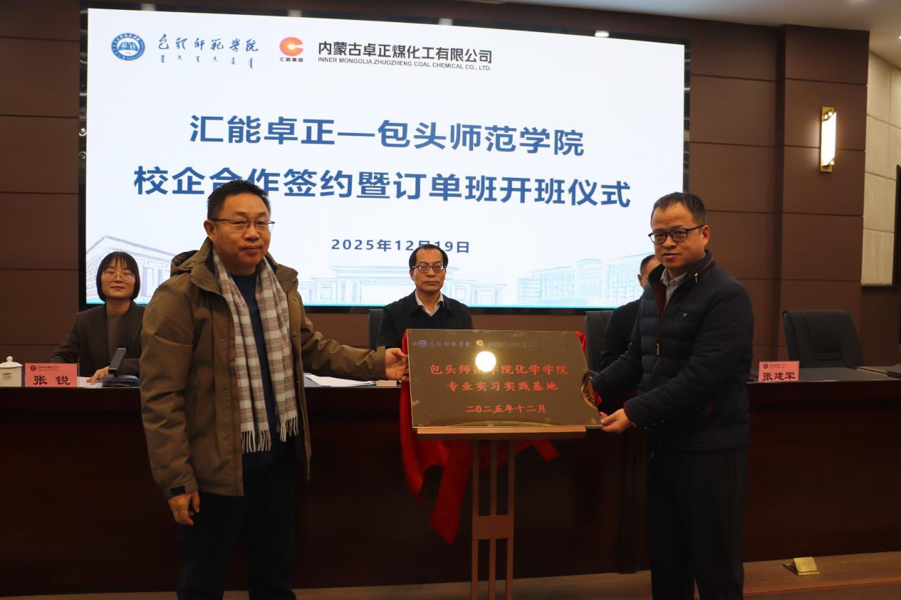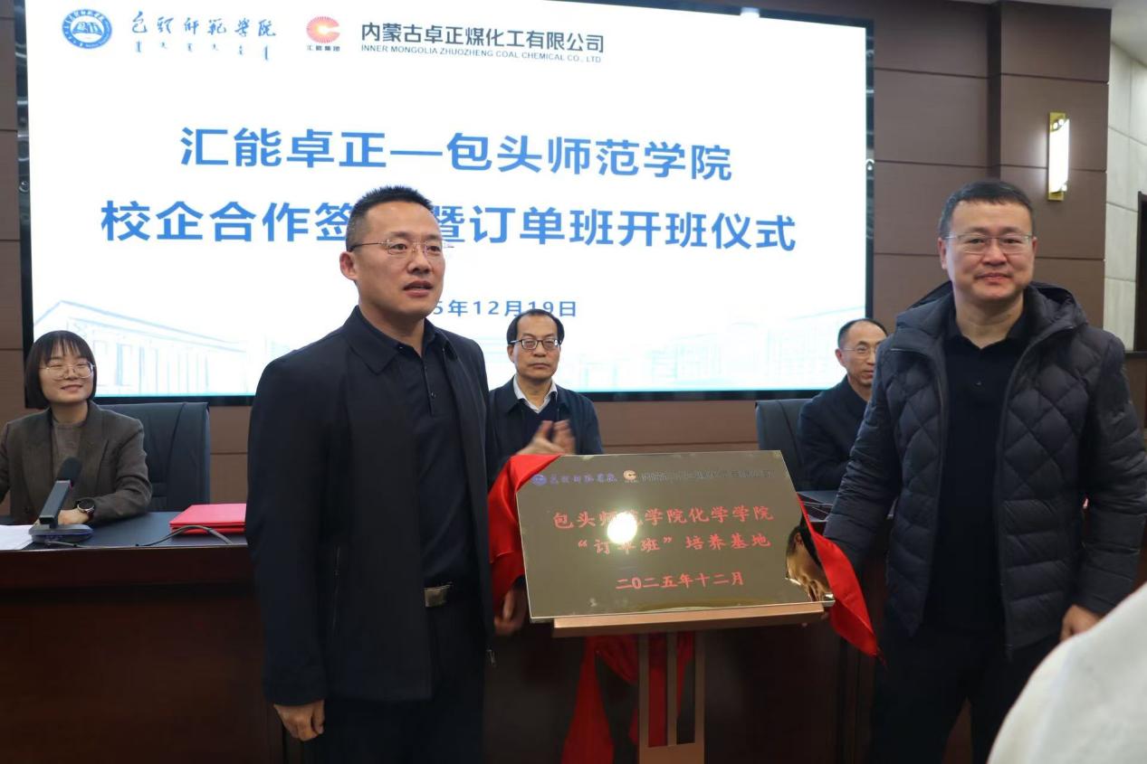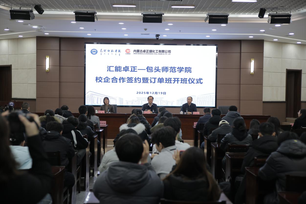 2025年12月19日,我校与汇能卓正校企合作签约暨“订单班”开班仪式在图书馆会议厅举行,内蒙古卓正煤化工有限公司总经理张建军一行5人,校党委委员、副校长马占飞,教务处、招生就业处、对外交流与合作中心负责人,化学学院班子成员、系主任、班主任、订单班学生、学生代表参加了会议。