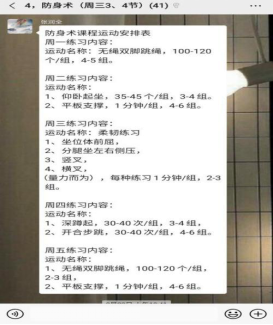 防身术课程虽然采用线上教学的方式,但是充满了激情与活力,老师提前录好视频,讲解动作要点,并通过同学们反馈的练习视频,纠正他们的错误动作;课后老师给同学们每天都布置了练习内容,让学生录好视频上传给组长能起到一个监督的作用。虽然疫情让我们只能在家上网课,但是不会降低体育课学习的质量和热情,在学习防身术技术中的一拳一腿体现着老师的严谨和我们的活力,和大家一起训练有数不尽的欢声笑语,我们一起进步!
