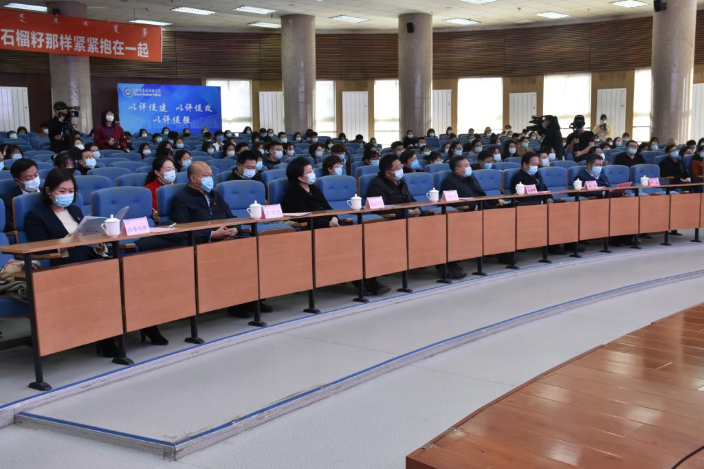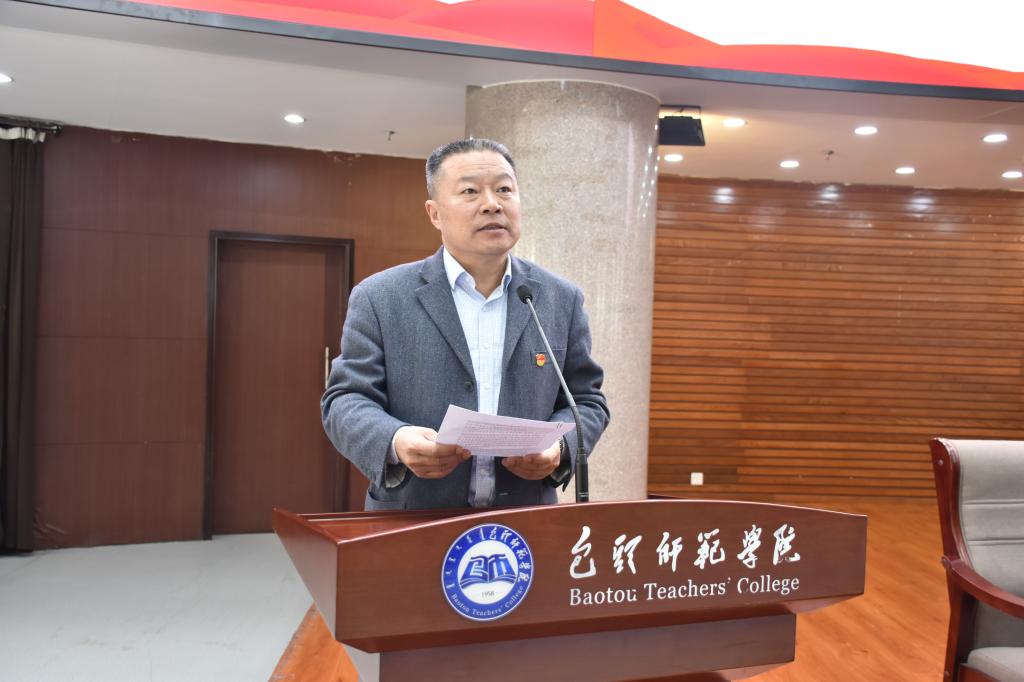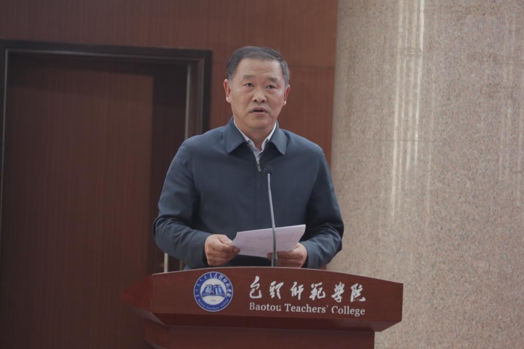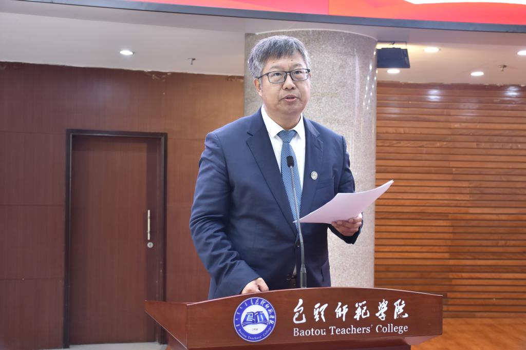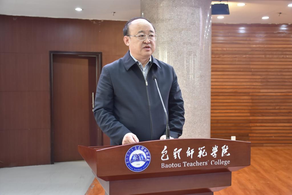 仪式上,校党委书记王永明致辞,向参加仪式的领导和师生们介绍了包头师范学院的基本情况。他指出,包师院作为民族地区的一所高等师范类院校,既要做铸牢中华民族共同体意识的主要政治高地,也要成为培育中华民族共同体意识的重要文化基地。就建设发展“包头市铸牢中华民族共同体意识研究中心”,王永明同志提出四点意见:一是要坚持以习近平新时代中国特色社会主义思想为引领,增强“四个意识”、坚定“四个自信”、做到“两个维护”,要以铸牢中华民族共同体意识为主线,全面贯彻党的民族理论和民族政策,建设具有地方特色的民族研究学科体系和学术体系,为实现中华民族伟大复兴的中国梦提供重要智力支撑;二是要以马克思主义民族理论研究优势为基础,落实习近平总书记关于民族工作的重要论述,进一步凝练优势及特色学术研究方向,鼓励支持更多师生进行相关研究,着力形成一批有影响力的研究成果,努力把研究中心建设成为培养具有“明辨大是大非立场特别清醒、维护民族团结行动特别坚定、热爱各族群众感情特别真挚”特质的人才摇篮,打造成为研究包头市民族领域基础理论问题和重大现实问题的重要基地;三是要通过“请进来、走出去”等不同方式,争取统战部、民委等部门的大力支持,广泛开展相关社会调研及考察,为高水平学术研究提供实践基础。同时,发挥师资优势,立足包头市、面向社会各界,开展铸牢中华民族共同体意识相关专题讲座及决策咨询等服务,并主动承担包头市经济社会发展相关课题,争取成为党政决策参谋、理论创新推进、时代问题剖析和包头经验诠释的重要力量,更好服务地方经济社会发展;四是要全力支持研究中心的建设,竭力做好人力、物力等方面的服务和保障工作,强化组织领导,明确研究内容,组建专家队伍,做细做实各项工作,及时开展研究工作,强化政策保障,建立激励机制,多出优秀成果。
