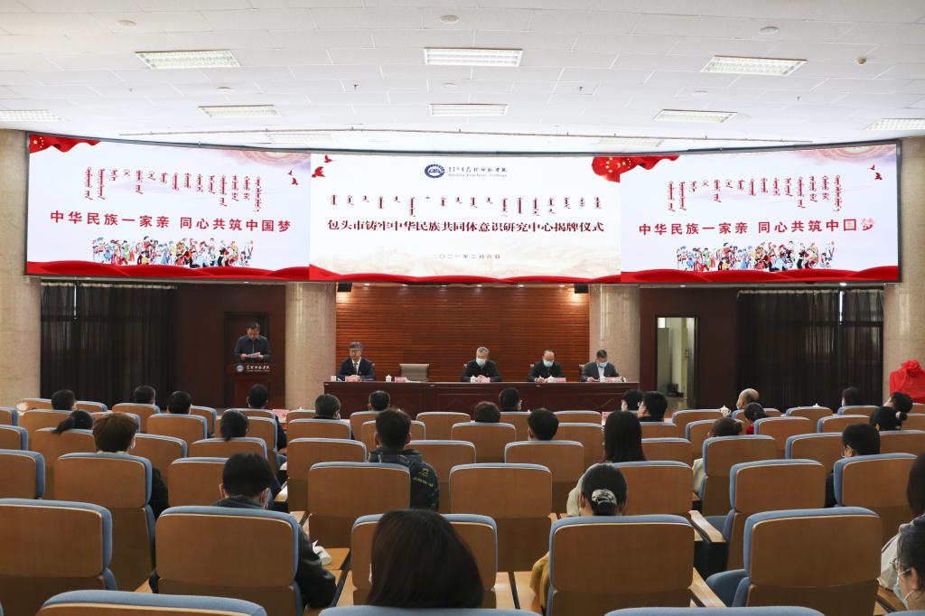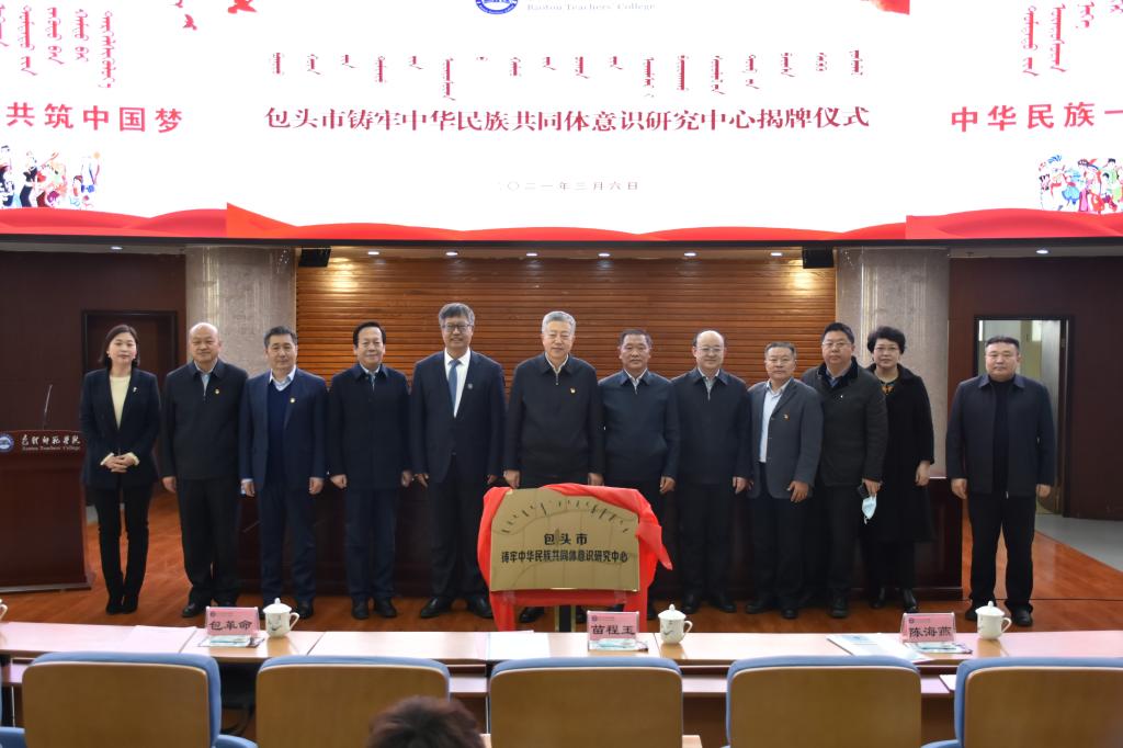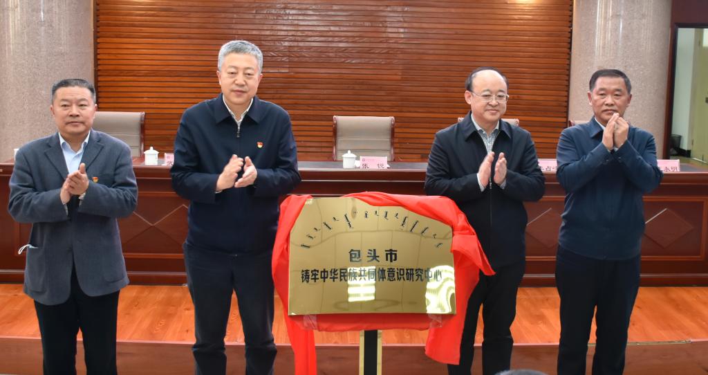 致辞结束后,主席台上领导共同移步台前,为“包头市铸牢中华民族共同体意识研究中心”揭牌,包头市铸牢中华民族共同体意识研究中心正式成立。