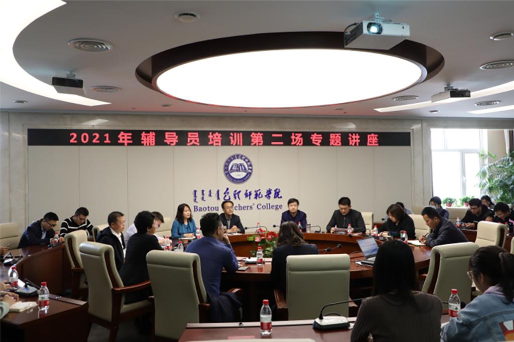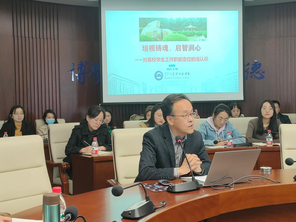 按照学校《2021年辅导员、班主任队伍培训实施方案》,3月30日下午,我校举办2021年辅导员培训第二场专题讲座。学生工作部全体人员、各学院党总支副书记、学工办主任、专兼职辅导员参加培训,学生工作部部长薛志东对我校2021年学生工作要点做了解读,美术学院党总支书记史继敏老师作了题为《培根铸魂、启智润心——对高校学生工作职能定位的浅认识》的专题讲座,学生工作部副部长刘国庆主持培训会。