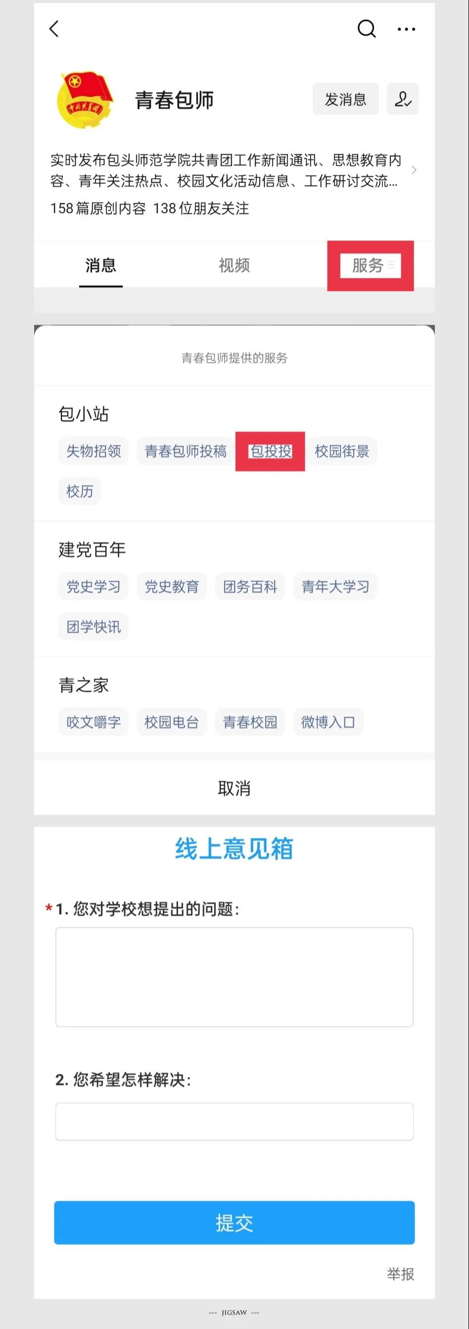从3月14日起,团委以线上线下相结合的方式收集同学们在日常生活中遇到的问题和对学校的建议,线下同学们可以通过齐志楼大厅放置的意见箱或到齐志楼124学生会值班室现场反馈意见和建议;线上可以通过“青春包师”公众号底部菜单栏中“包小站”反馈意见或建议。此项工作将作为本年度的常项工作持续开展。截至目前,共收集到100余名同学的50余条意见建议(整合后)。其中,部分问题已得到实质性解决并反馈给学生本人,另有少部分问题已经向相关部门反馈,正在协调解决中。