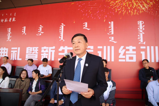 内蒙古自治区新世纪321人才工程第一层次人才、自治区教坛新秀、自治区创新先锋岗获得者、我校数学科学学院院长赵国忠作为教师代表发言,郑重承诺将恪尽职守、殚精竭虑,完成好教书育人、科学研究和文化传承的工作。他对同学们的大学生活提出期望:一是要坚定理想信念,厚植家国情怀;二是要勤奋学习,夯实专业基础;三是要多读书,勤思考,善作为;四是要坚持锻炼身体,注重身心健康。他希望同学们坚定理想信念,勇担历史使命,为国家富强和民族复兴不懈奋斗,铸就精彩人生。
