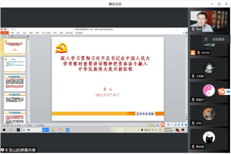 5月30日下午,党委委员、副校长双山以“深入学习贯彻习近平总书记在中国人民大学考察时重要讲话精神,把青春奋斗融入中华民族伟大复兴新征程”为主题,为研究生院党支部上了一堂生动的党课。党课以线上形式进行,研究生党员、入党积极分子共115人认真聆听了讲授。
