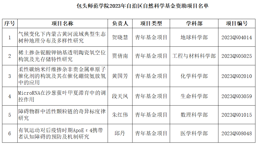 附:包头师范学院2023年度内蒙古自治区自然科学基金项目立项名单