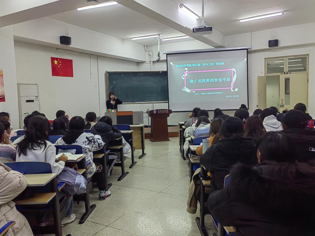 党的二十大报告指出:广大青年要坚定不移听党话、跟党走,怀抱梦想又脚踏实地,敢想敢为又善作善成,立志做有理想、敢担当、能吃苦、肯奋斗的新时代好青年。为了加强学生干部队伍建设,提高我院学生干部的政治素养和服务水平,有效发挥学生干部在学校日常管理中的重要作用,教育科学学院于11月22日晚在博西606举办了第五期“青马工程”培训第三讲,讲座由辅导员王璐然主讲,100名学生干部参加培训。