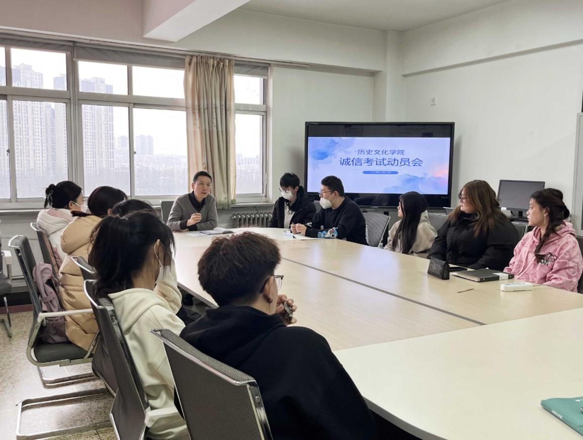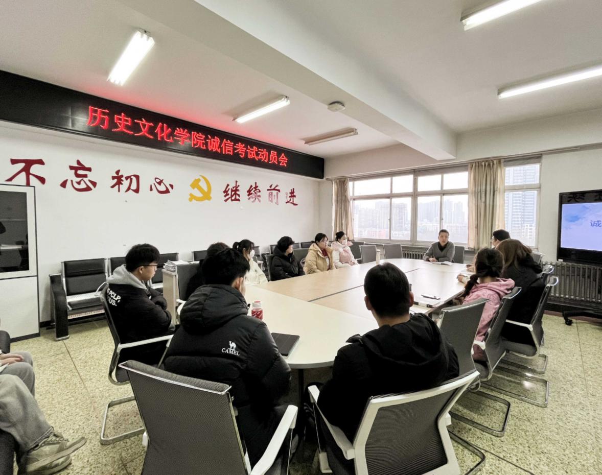 为增强诚信应考的意识,进一步加强学风建设,严肃考风考纪,杜绝舞弊行为,营造良好的考试氛围,构建诚信校园。12月22日下午15:00时,历史文化学院在博学楼801会议室召开了诚信考试动员会。学院党总支副书记吴冰出席动员会,全体学生骨干、党员和各班级学生代表参加。