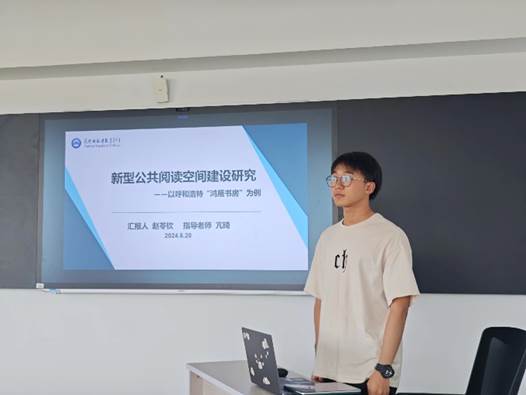赵苓钦同学从新型公共阅读空间的定义、特点、类型、我国新型公共阅读空间建设概况,以及呼和浩特城市书房发展现状等方面做了汇报。汇报结束后,同学们分别从新型公共阅读空间建设的目的、问题和优化对策等角度进行了提问和交流。