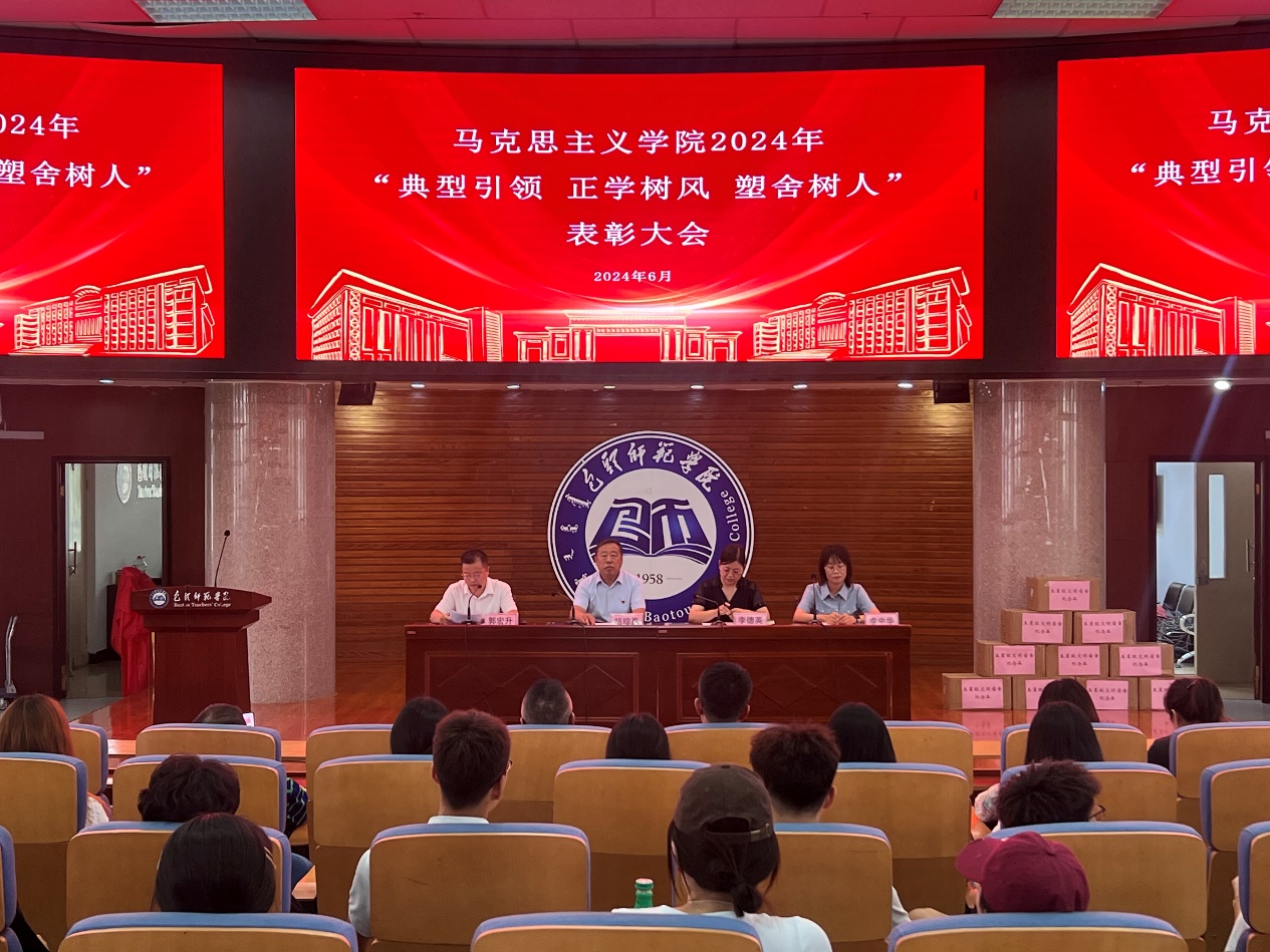 为深入贯彻落实《包头师范学院“一站式”学生社区综合管理模式建设实施方案》《“打造公寓文化,创造优良学风”正学树风计划实施方案》等文件精神,引导激励学生勤奋学习、锐意进取、奋发有为、成长成才,2024年6月20日下午,马克思主义学院在博学楼学术报告厅召开了2024年“典型引领、正学树风、塑舍树人”表彰大会。马克思主义学院全体教师、班主任、辅导员、研究生、本科生、预科生参加了会议。会议由学院党总支副书记郭宏升主持。