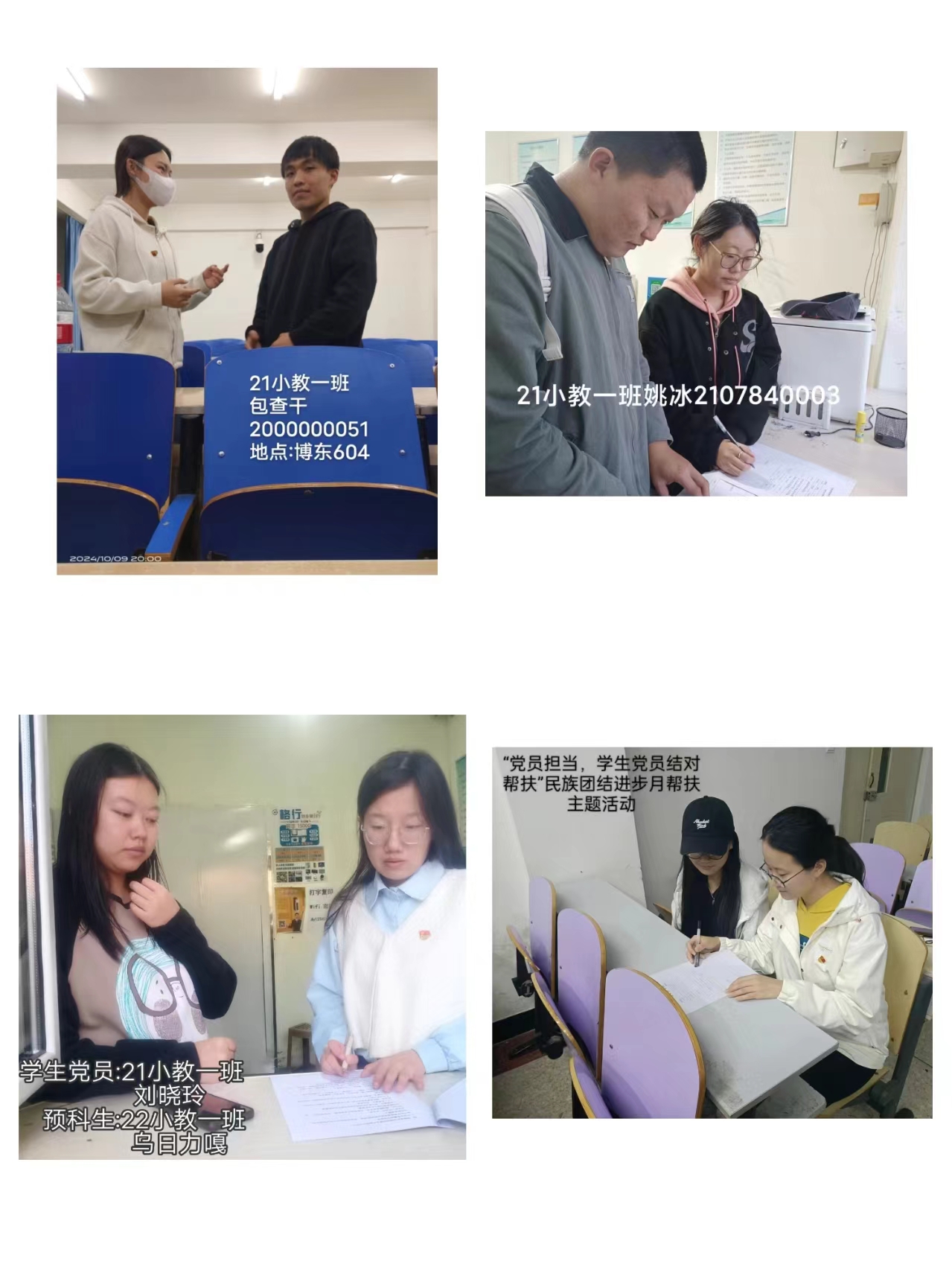 为深入学习贯彻党的二十大精神和党的二十届三中全会精神,进一步增强学生的党员意识和社会责任感,强化学生党员联系群众、服务群众的自觉性,确保本科教育教学审核评估顺利通过,2024年9月24日-10月9日期间,教育科学学院组织20名大四学生党员,深入学生生活阵地,与2022级和2023级预科生结对,通过谈心谈话、沟通交流,帮助预科生夯实基础,及时掌握有效学习方法,共同成长。
