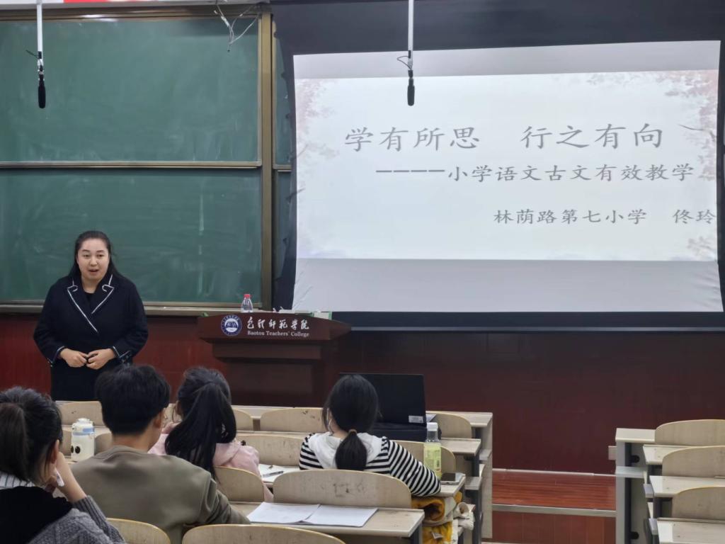 2024年10月9日晚,包头师范学院“师说讲坛”第六讲在博学楼正式开讲。本次讲坛邀请包头市优秀教师、昆区教学能手佟玲老师,以“学有所思,行之有向——小学语文古文有效教学”为题做专题讲座。2021级卓越教师班全体学生、教师教育学院(教师发展中心)部分教师参加了讲座。讲座由教师教育学院(教师发展中心)副院长张宇宏主持。