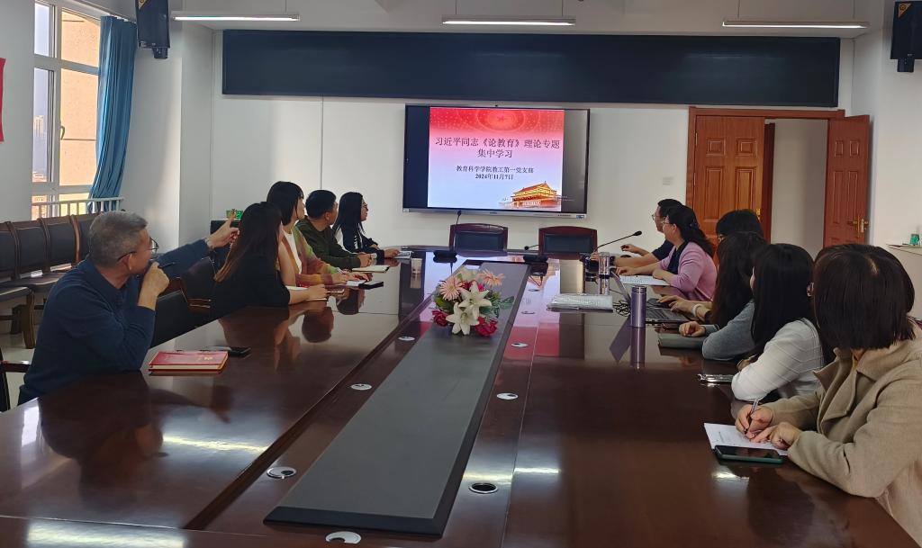 为了深入学习领会习近平总书记关于教育的重要论述,更好地指导党员教师创新教育教学工作,2024年11月7日,教育科学学院教工第一党支部在恒德楼1313会议室开展习近平同志《论教育》理论专题集中学习活动。活动由齐磊老师主持,全体党员教师参加。