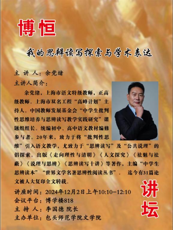 文学院于12月2日上午在博学楼818举办博恒讲坛,余党绪教授应邀为我院师生作题为《我的思辨读写探索与学术表达》的专题讲座。讲座由文学院院长李国德主持。