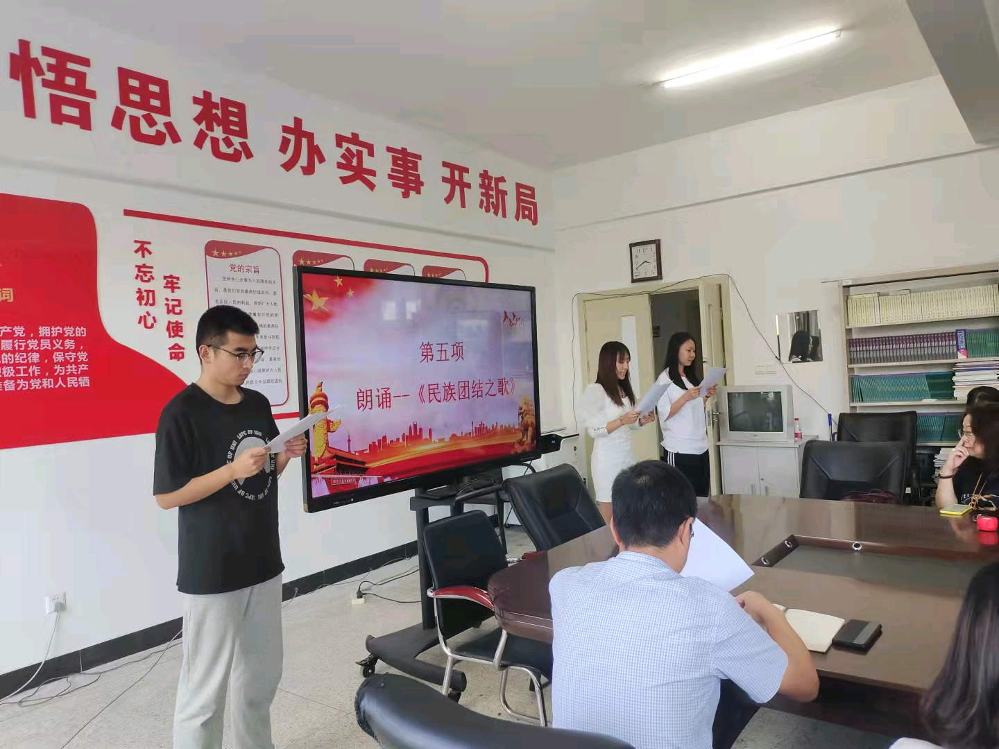 会上,全体党员共同观看了《内蒙古自治区促进民族团结进步条例》解读和民族团结的宣传片,学生党员代表刘建颖、李娜、谢雨和李敏等人交流发言,作为一名学生党员,一定会从自身做起,增强“四个意识”,坚定“四个自信”,做到“两个维护”,加强民族团结,铸牢中华民族共同体意识。教师党员代表陈晨、学生党员代表周园、王依雪凝和李雯分别朗诵《人民至上》《民族团结之歌》。伴随着外国语学院全体党员师生共唱歌曲《爱我中华》,民族团结进步主题党日活动圆满结束。