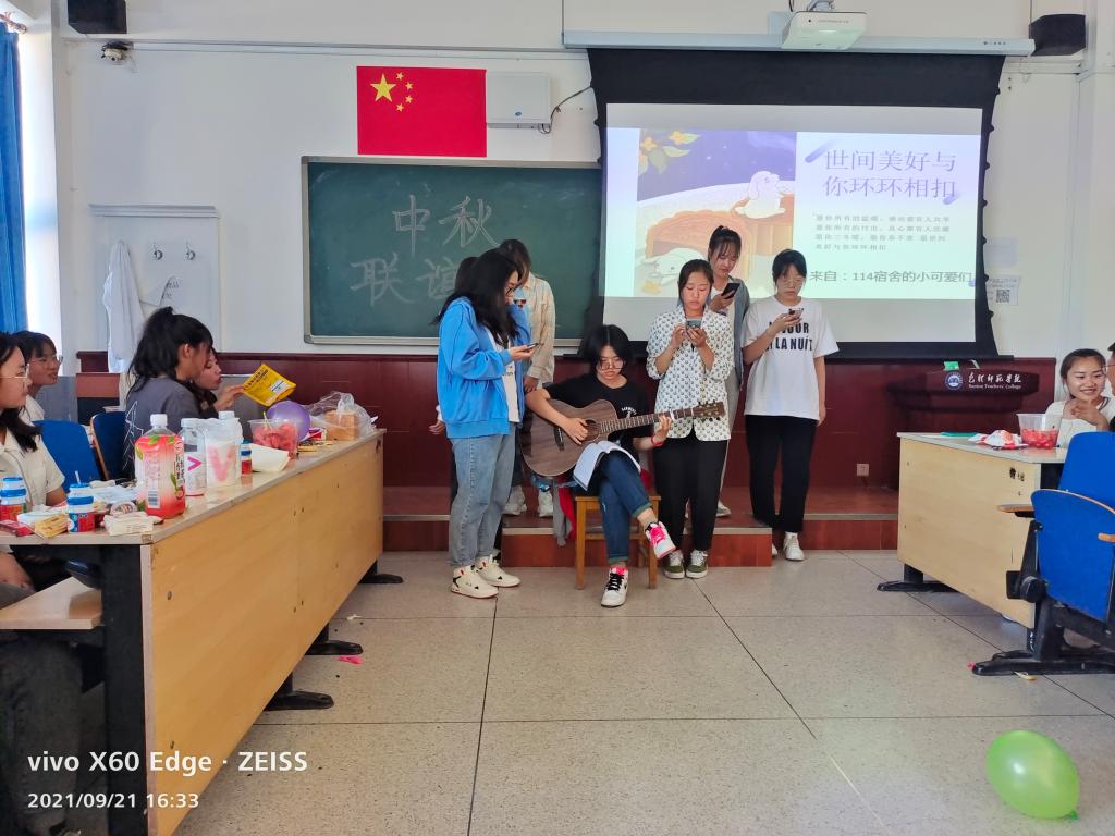 此次活动在学院领导的支持下,按照教科院多年来的传统做法,专为新生安排的迎新生、庆佳节活动。21级助理班主任带领班委进行了紧锣密鼓的筹备,反复排练节目,采买活动用品,熟悉活动流程,布置活动现场。整个活动节奏紧凑、内容丰富,精彩纷呈,设置了歌曲演唱、游戏互动、小品相声表演等环节。流行歌曲演唱等开场节目赢得阵阵喝彩,小品、相声各出新裁,古典、爵士舞蹈更让同学们大饱眼福,精彩绝伦的说唱表演将联欢会推向高潮,大家彼此祝福,在悠扬的歌声中,同学们一起吃月饼,一起交流感情。在“中秋诗词对答”环节中,同学们奋力争先,抢答积极,对答如流,充分展现了大家扎实的诗词储备能力;在“你画我猜”、“数字炸弹”等游戏环节中,各小组同学齐心协力,相互配合,展现出团队协作能力,随后在“脑筋急转弯”、“谁是卧底”游戏中,每位同学各自为营,思维敏捷,具有极强的应变能力;各班的合唱曲目,歌声嘹亮,感情真挚。