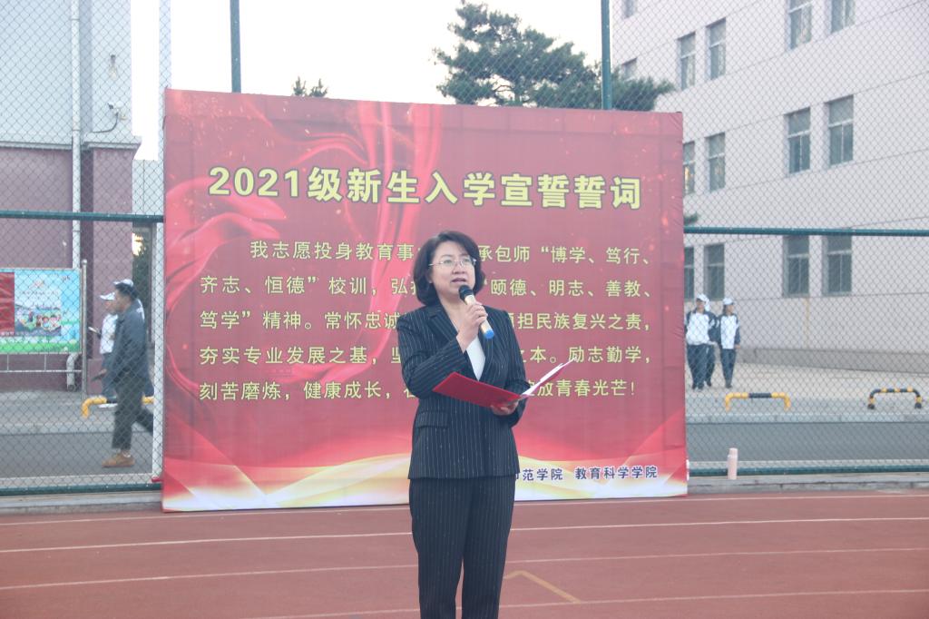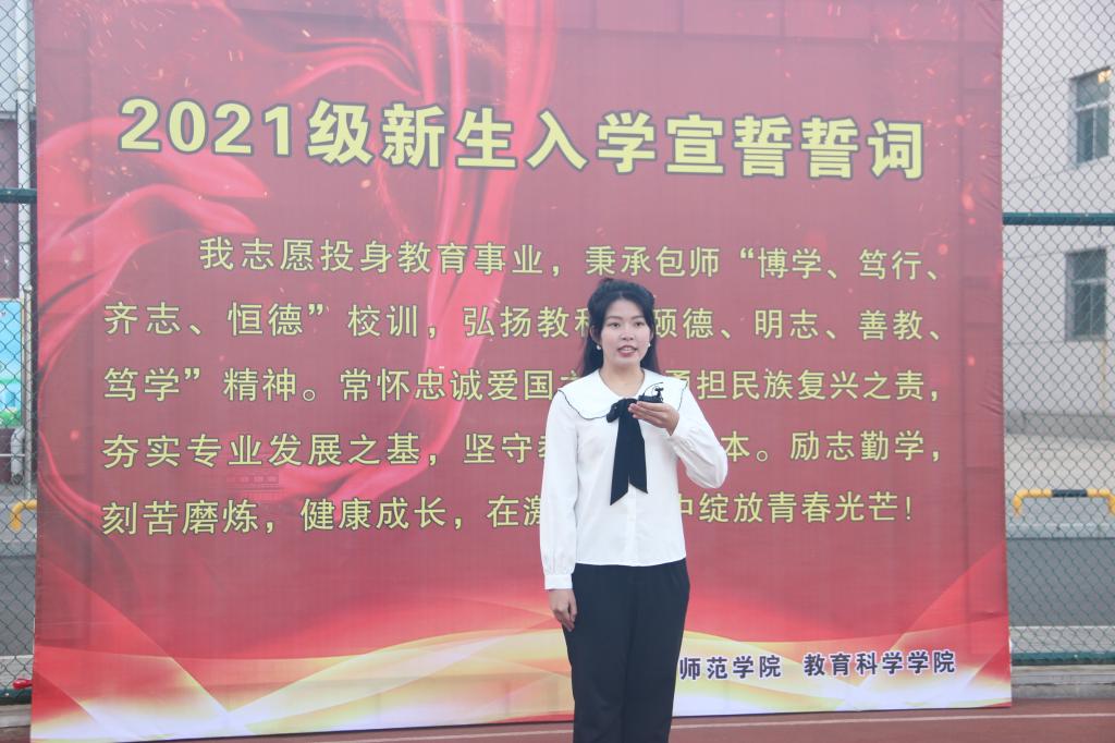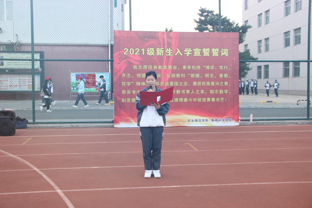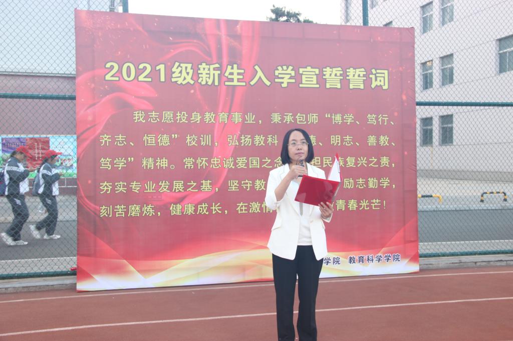 升国旗仪式后,进行2021级新生入学宣誓仪式。由党总支书记张岫峰带领新生一起宣读入学誓词,全体师生在国旗下举起右拳,庄严宣誓:“我志愿投身教育事业,秉承包师“博学、笃行、齐志、恒德”校训,弘扬教科“颐德、明志、善教、笃学”精神。常怀忠诚爱国之念,勇担民族复兴之责,夯实专业发展之基,坚守教书育人之本。励志勤学,刻苦磨炼,健康成长,在激情奋斗中绽放青春光芒!”随着一句句令人激情澎湃、热血沸腾的誓词铮铮落地,一种强烈的荣誉感、自豪感、责任感和使命感在每位师生的心中油然而生。宣誓结束后,21级小学教育专业包苏敦同学代表新生做了国旗下的演讲。她讲到,作为新生,从誓词中感受到了动力,对未来的大学生活充满了希望,同时希望全体新生能做到誓词中的要求,秉承“颐德、明志、善教、笃学”的院训,严格自律,开拓创新,在未来的四年里,在教育科学学院这个拥有良好师德师风氛围的环境下,一步步走向成熟、自信、自立、自强,成为有知识、有抱负、肯努力、能奉献的四有青年,向一名合格的人民教师迈进。最后,李芳院长做了动员讲话。她提到,学院首次将宣誓环节加入新生入学教育活动中,目的在于激发师范生的教育情怀,通过仪式感的营造和渲染,向同学们传递包师校训、教科院训丰富的价值观念和文化底蕴,李院长希望新一代的师范生,要努力践行师德,以立德树人为己任,遵守教师职业道德规范,具有依法执教意识,立志成为有理想信念、有道德情操、有扎实学识、有仁爱之心的“四有”好老师。
