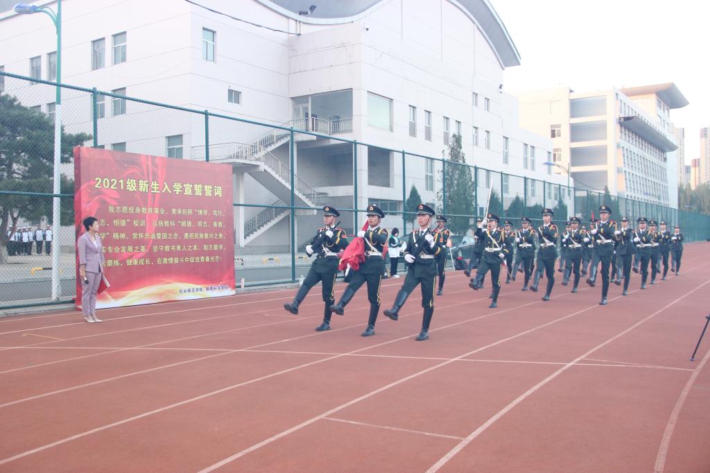 入学教育仪式在庄严震撼的升国旗仪式中拉开帷幕。首先,我校国旗班28名队员组成的方阵,迈着整齐有力的步伐,护送国旗走向升旗台,现场庄严的气氛激荡着在场所有师生的心灵。当雄壮的国歌旋律响起时,全体师生神情庄重,齐声高唱国歌,向徐徐升起的五星红旗行注目礼。