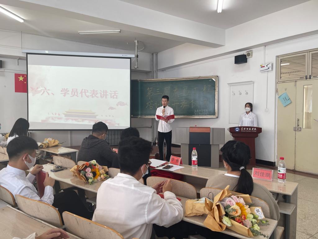 随后,上一届学生干部为新一届学生干部颁发聘书,新一届学生干部代表为上一届学生干部献花。之后,上一届学生干部代表孙涛发言,他首先对学院的悉心栽培表示感谢,随后讲述了自己身为学生干部的经历,分享了自己的经验与体会,并且指出学生干部要践行为同学服务的职责,严格要求自己,起到表率作用。最后,本次培训学员、教师职业技能发展部部长刘超做表态发言,他强调学生干部应具备过硬的政治素质、思想道德素质、能力素质、身体素质和心理素质,并代表全体学员向学院郑重承诺要珍惜此次学习机会,积极参加每一次培训课程,做好笔记,课后进行反思与总结,真正做到学有所获。