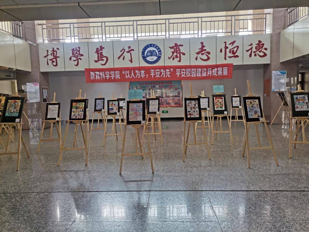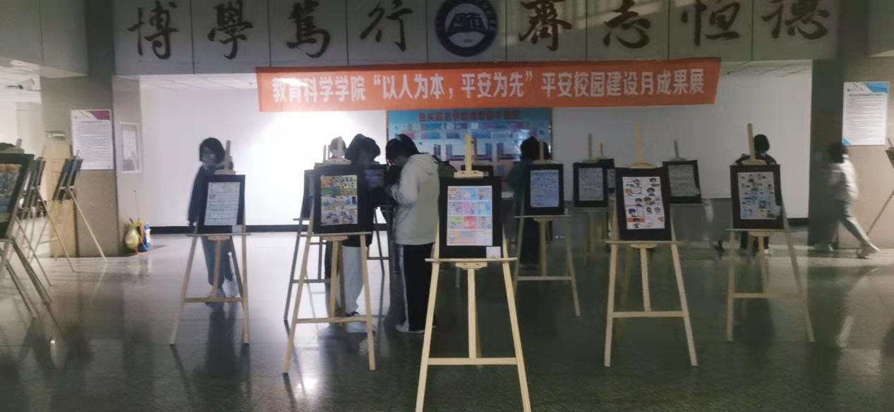 和谐校园,平安为先,安全之责,尽在你我。为了进一步增强学生的安全防范意识与法律意识,提高广大学生安全防范能力,教育科学学院积极落实学校安全教育工作要求,通过多途径、多渠道的活动形式,深入开展安全知识教育和普及,于10月25日至10月30日在博学楼一楼大厅举办“以人为本,平安为先”的活动作品成果展,让校园安全走进每一位同学的心中。本次活动具体由教育科学学院学工办辅导员刘佳琪老师负责。