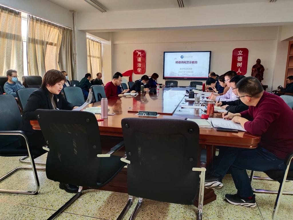 12月2日下午,数学科学学院在博学楼718会议室召开2021年师德师风专题警示教育大会,会议由党总支书记朱丽主持,全体教职工参加会议。