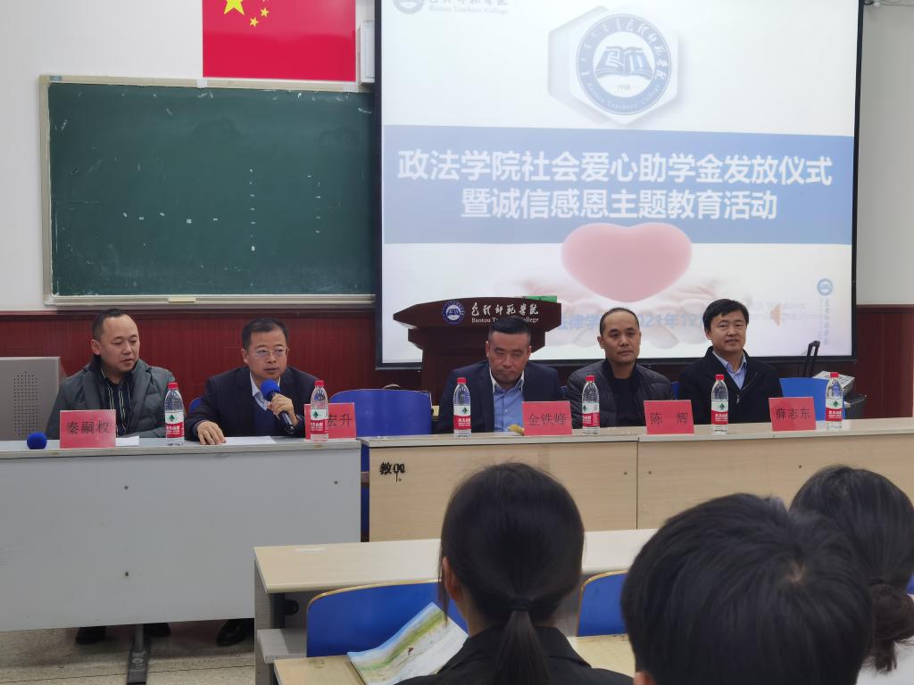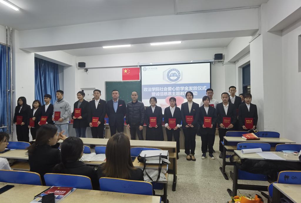为践行“我为师生办实事”承诺,帮助家庭经济困难学生减轻负担、更好地完成学业,激励他们努力学习、自立自强、不断提升自身素质,2021年12月9日晚上,政法学院在博学楼西505室举办了社会爱心助学金发放仪式暨诚信感恩主题教育活动。社会爱心人士金铁峰、陈辉两位先生、学生工作部部长薛志东、政法学院工会主席秦嗣权出席了发放仪式,获得资助学生、部分学生代表90多人参加了此次活动。仪式由政法学院党总支副书记郭宏升主持。