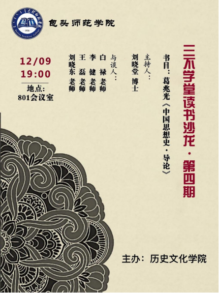 本次读书沙龙的交流书目为葛兆光的《中国思想史·导论》。活动中,刘晓堂博士首先分享了读书心得与感悟。他认为,读书足以怡情,足以博彩,足以长才,鼓励大家一点要在有限的时间里多读书多思考。白禄老师说,每个读者有其书,每本书有其读者,鼓励大家在阅读中充实自己。李健老师与大家交流了关于葛兆光《中国思想史·导论》的感想,特别推荐了娜塔莉·泽蒙·戴维斯的《档案中的虚构》一书。刘晓东老师分享了自己的读书方法和经验体会,强调要多多汲取相邻学科的知识和理论。他从社会学和政治学的角度讲述了对本书的感悟,带给大家很多心灵的启迪和震撼。白禄老师从阅读史的角度出发,更多地强调在信息时代注意避免知识鸿沟的出现。他强调,自上而下的视角与自下而上的视角的有机结合,力推阅读史名著《奶酪与蛆虫:奶酪与蛆虫:一个16世纪磨坊主的宇宙》(广西师范大学出版社2021年版)。