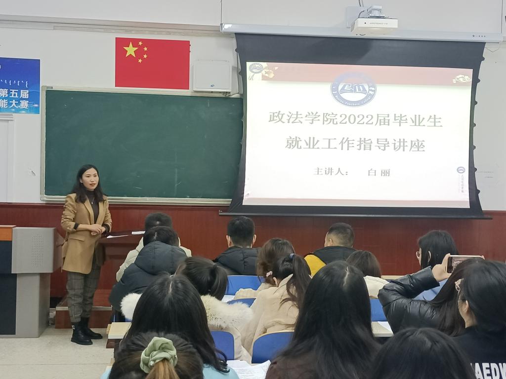 12月16日下午,政法学院在博学楼502教室举办了2022届毕业生就业指导讲座。在校毕业生参加了此次讲座,讲座由负责就业工作的辅导员白丽老师主讲。