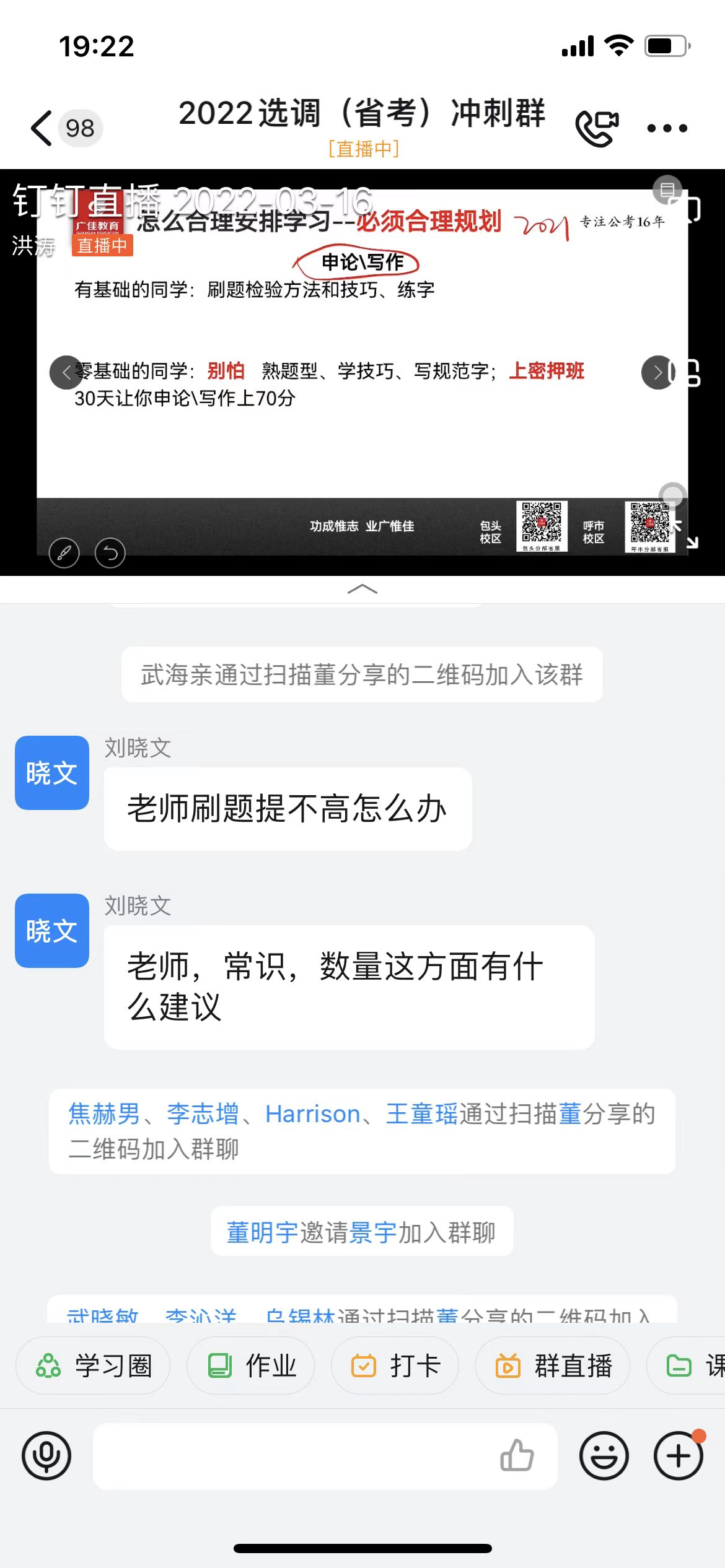 辅导讲座通过钉钉直播进行。曹老师首先对因新一轮疫情而推迟的考试时间进行了预测,随后分别对有基础和零基础的学生如何合理安排复习提出了有针对性的建议,提醒学生多刷题、练好字、掌握高频考点。最后,曹老师还介绍了申论的备考要点及应试技巧。(数学科学学院)