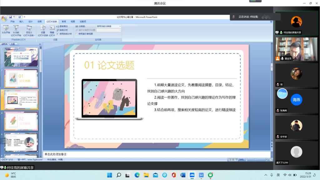 为进一步了解研究生论文工作的进展情况,确保我院2020级硕士研究生顺利完成毕业论文工作,3月31日,数学科学学院2020级学科教学(数学)专业硕士研究生毕业论文进展汇报在腾讯会议线上举行。此次报告会全体导师组成员参加,2021级全体研究生旁听。