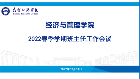 为全面做好疫情防控期间学生教育管理服务工作,进一步强化班级管理,确保各项工作平稳有序开展,3月31日下午,经济与管理学院线上召开2022春季学期班主任工作会议。学院党总支副书记赵洪宝,全体班主任老师和辅导员参加会议。