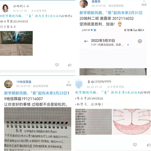 为帮助同学们养成合理的作息习惯,提高学习效率。资源与环境学院于3月21日-4月1日举办了为期十天的“新学期新风貌,‘易’起向未来”线上打卡活动。