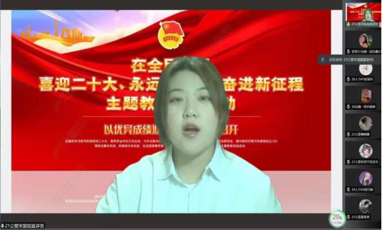 党的二十大是我们党在进入全面建设社会主义现代化国家、向第二个百年奋斗目标进军新征程的重要时刻召开的一次十分重要的代表大会,是党和国家政治生活中的一件大事。20人力资源班的王杭蓉同学呼吁,我们作为党的新一代接班人,将迎接党手中的旗帜,走党的道路,创造辉煌的未来,继续书写党史的续集。