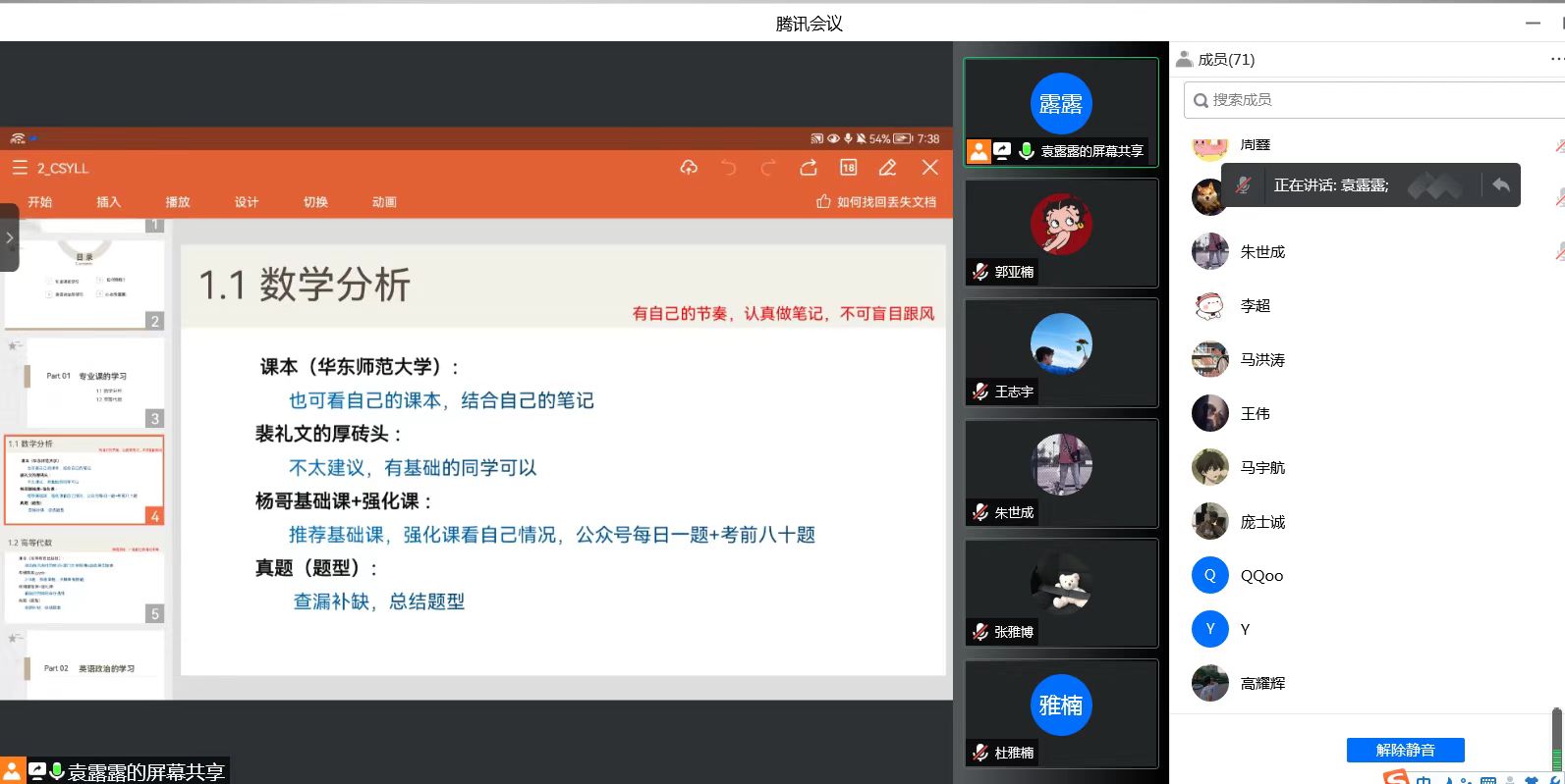 为了帮助2019级学生尽快选定发展方向,避免学生盲目跟风考研或错失良机,4月17日,数学科学学院邀请2021届数学与应用数学专业毕业生,现分别就读于太原理工大学、郑州大学、山西师范大学、陕西师范大学的高耀辉、袁露露、王志宇和赵晗彤,为2019级有考研意愿学生做考研经验交流讲座,学院专职辅导员、2019级班主任及2019级同学参加分享交流会。