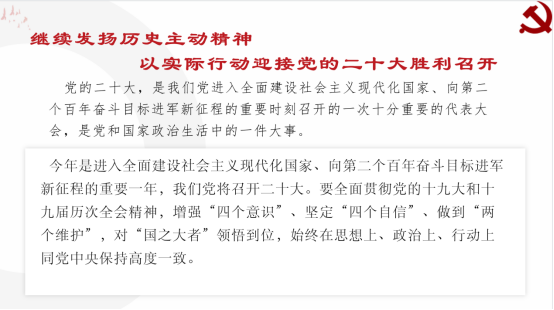 党的二十大是我们党进入全面建设社会主义现代化国家、向第二个百年奋斗目标进军新征程的重要时刻即将召开的一次十分重要的代表大会,是党和国家政治生活中的一件大事,我们是新时代的大学生,更应该在党的领导下,关注国家发展,担负起新时代大学生该有的责任与担当。在视频“我们共同努力,以实际行动迎接党的二十大胜利召开”的声音中,本次党史学习教育知识分享会议圆满结束,此次会议时间虽然短暂,但让同学们对党史、对即将到来的二十大,有了更为清晰的认知。