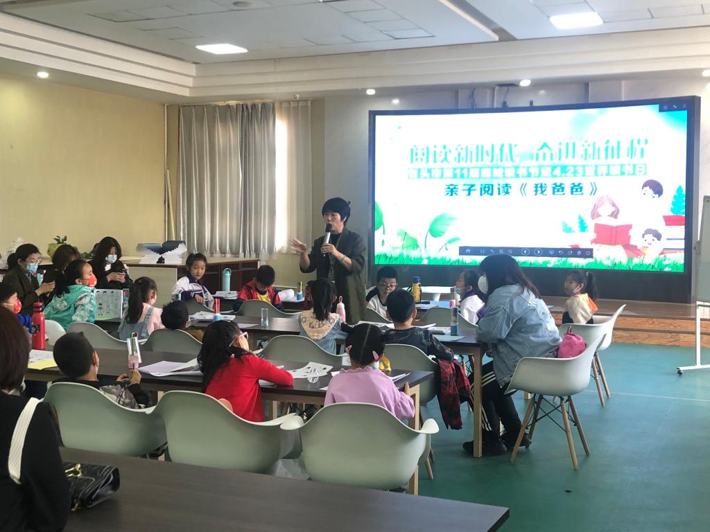 4月23日上午9:00-10:30,线下阅读活动在青山图书馆五楼阅读分享厅进行,20组家庭参与了活动。教育科学学院的王敏和樊荣老师作为活动主持人,分别主持了“朗读《我爸爸》”、“说说我爸爸”和“画画我爸爸”的环节。王敏老师将朗读、理解、语言训练融为一体,带领小朋友模仿绘本的句式进行仿说;樊荣老师在学生现场生成的语言材料的基础上,提供绘画素材,讲解绘画技巧,指导学生创作绘本,然后帮助他们进行现场装裱,并进行了作品分享。