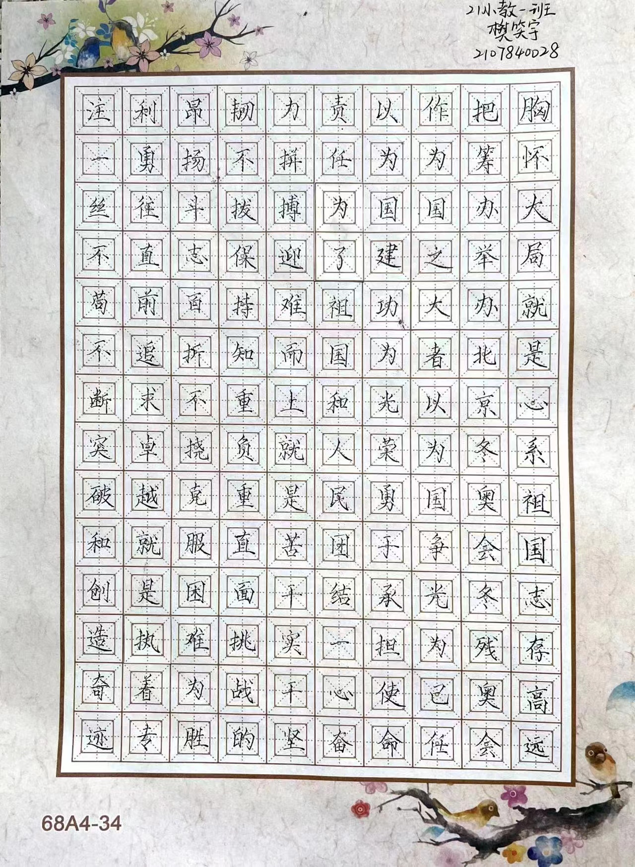4月11日-14日,教育科学学院学生会文体部举办“喜迎二十大,永远跟党走,奋进新征程”——享冰雪盛会,承奥运精神硬笔书法比赛活动。习近平总书记在北京冬奥会冬残奥会总结表彰大会上强调,北京冬奥精神就是胸怀大局、自信开放、迎难而上、追求卓越、共创未来。我们要大力弘扬北京冬奥精神,以更加坚定的自信、更加坚决的勇气,向着实现第二个百年奋斗目标奋勇前进,向着实现中华民族伟大复兴的中国梦奋勇前进。同学们认真学习了习近平总书记的重要讲话,并通过硬笔书法的形式,进行摘抄,一笔笔铿锵有力,姿态横生,如行云流水般洒脱。通过本次活动,不仅点燃了同学们对硬笔书法的热情,丰富了同学们的奥运知识,而且增强了同学们的奥林匹克精神。