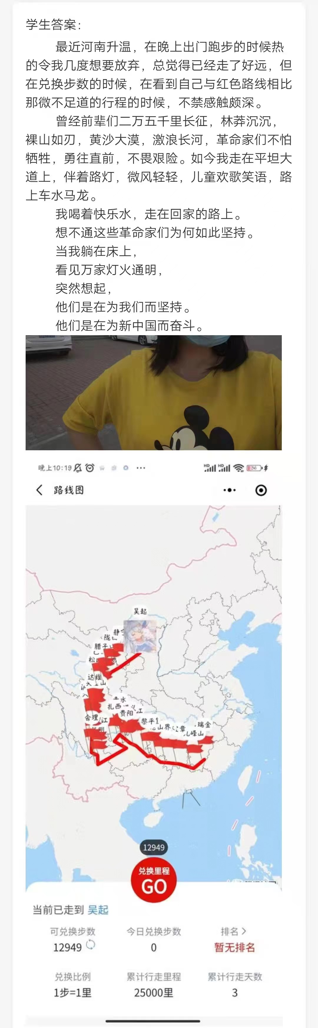 4月6日-4月10日,教育科学学院学生会广宣部开展“喜迎二十大,永远跟党走,奋进新征程”---追寻红色记忆,熔铸民族之魂活动,该活动采取沉浸式交互式教学,线下完成健步走,线上积累“长征路”的形式,227名同学通过微信小程序“线上健步走”来报名参加,通过线上重走长征路的的形式,将健身活动与红色教育相结合,在挑战中学习党的历史,磨炼自我意志,践行长征精神。在为期五天的时间里,同学们每日在完成规定的步数后,返回小程序“线上健步走”里进行步数兑换里数,直至完成万里长征。以瑞金为起点,先后经过36个具有革命意义的事件或地点,到达不同的地点,显示不同的长征历史知识和相关党史知识,最后达到胜利会师。血站湘江、四渡赤水、飞夺泸定桥、跨越大草地......这些英雄史诗,随着里程数的增加而出现,让同学们更加了解长征途中的艰难。在活动的最后一天,同学们在学习通上,上传自己的活动照片以及对活动的感想心得。他们将自身的实际情况与长征精神结合,抒发了对革命战士的敬佩与赞美之情。