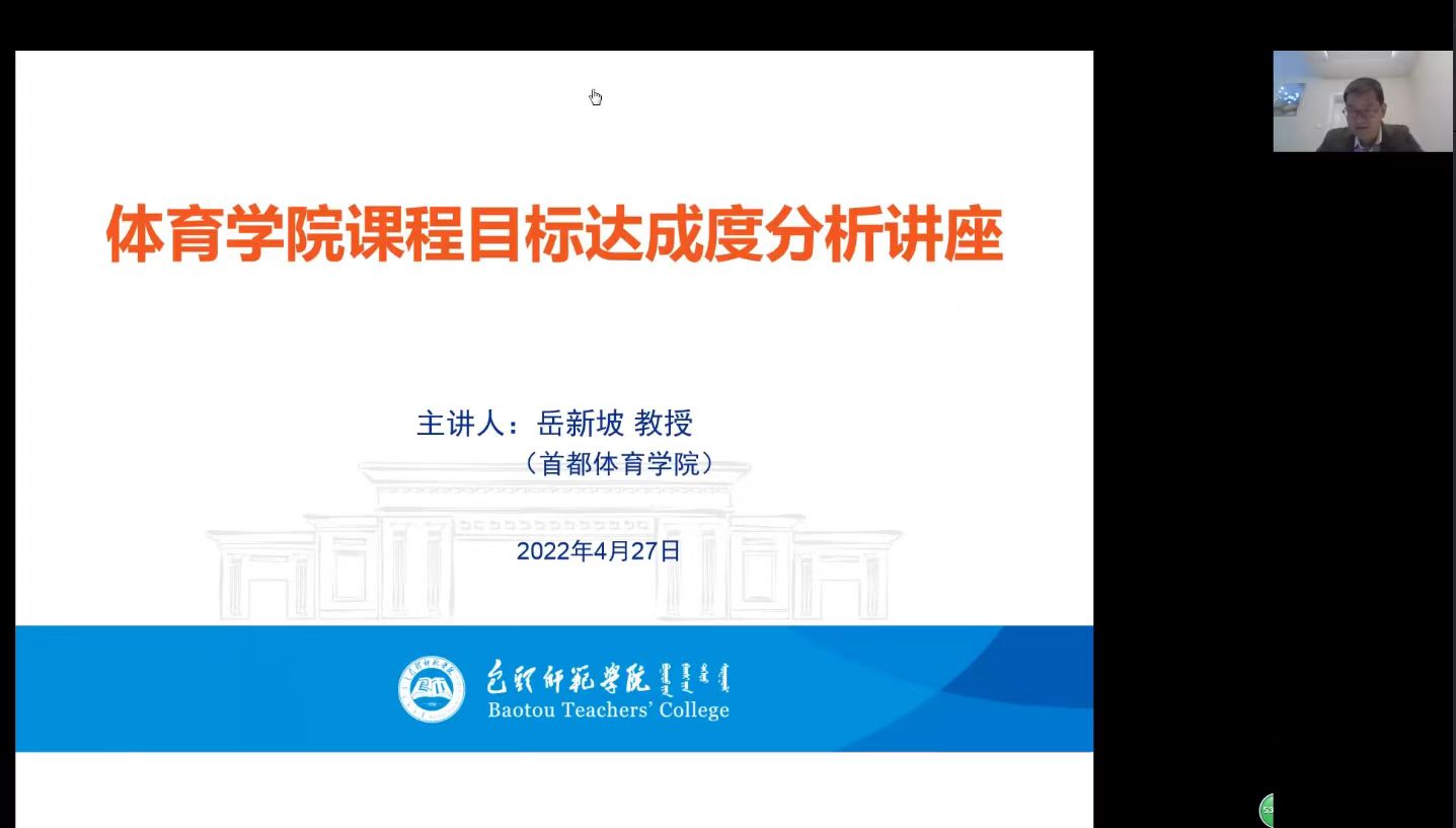 为推进体育教育专业认证工作顺利开展,4月27日,体育学院举办了关于课程目标达成度分析的讲座,本次讲座邀请到首都体育学院岳新坡教授,以“师范类专业认证视域下课程目标达成度评价”为主题为全体教师进行讲解。讲座以视频会议形式举行,体育学院院长车志宏主持,全体专任教师参加了会议。