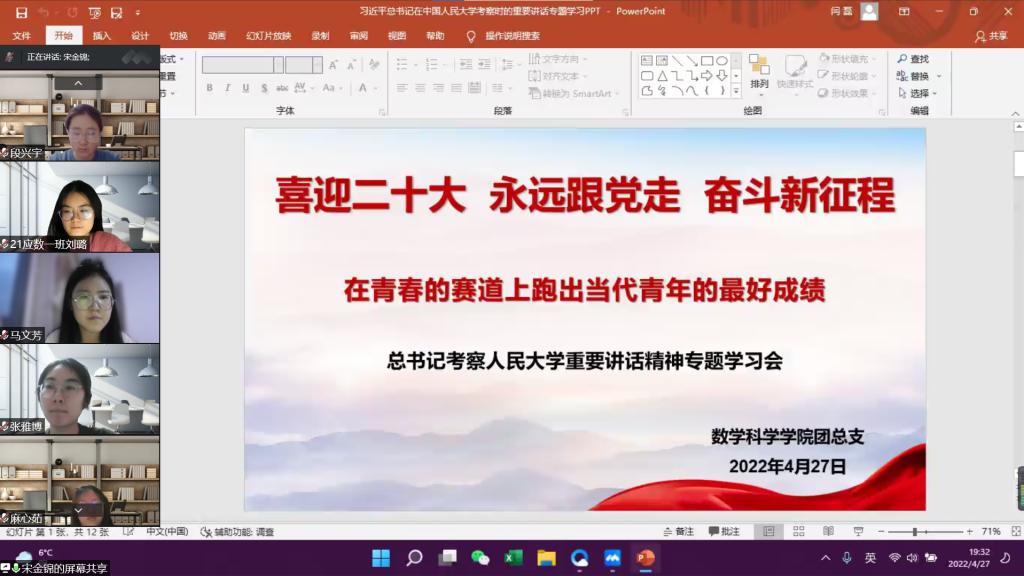 在五四青年节即将到来之际,习近平总书记到中国人民大学考察调研,激励青年学生在青春的赛道上奋力奔跑,争取跑出当代青年的最好成绩。4月27日,数学科学学院团总支及时组织线上专题学习会,传达学习习近平总书记考察人民大学重要讲话精神,学院辅导员、团学干部参加专题学习。