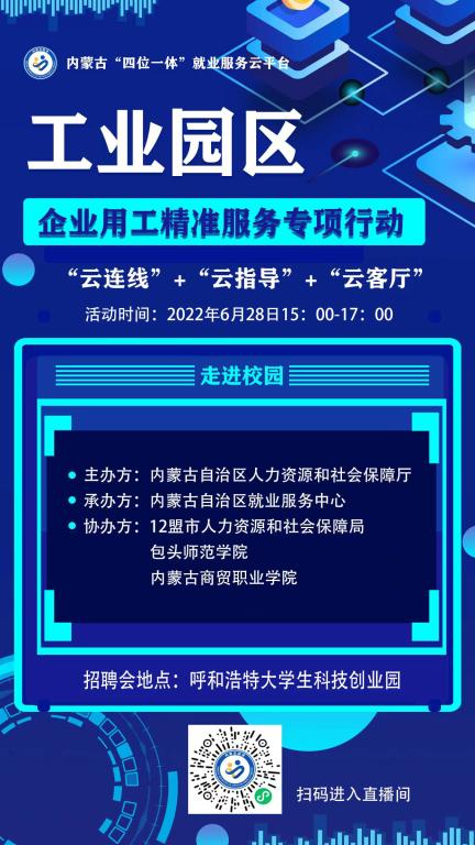 6月28日下午,由内蒙古自治区人力资源和社会保障厅主办,内蒙古自治区就业服务中心承办,12盟市人力资源和社会保障局、包头师范学院、内蒙古商贸职业学院协办的“工业园区——企业用工精准服务专项行动”如期举行,本次专项行动通过内蒙古“四位一体”就业服务云平台,采用“云连线”+“云指导”+“云客厅”的方式打通企业招聘和学生就业的通道。招生就业处积极向学生宣传本次招聘活动并积极组织学生对接企业,帮助学生精准就业。