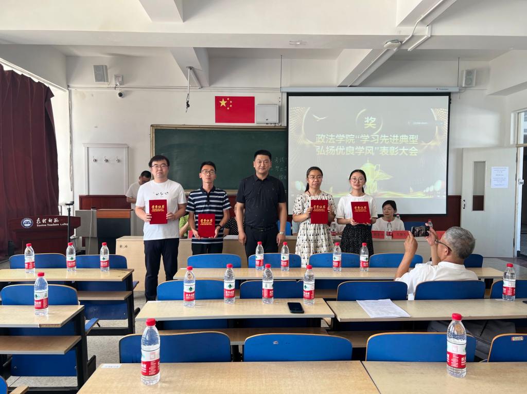 为激励全院师生争创优良学风班集体、争当优秀班主任,6月23日下午,政法学院在博学楼500教室召开了“学习先进典型,弘扬优良学风”表彰大会。我校学工部副部长刘国庆,政法学院党总支书记高德胜、副院长李霞,法学系、政治与行政学系、社会工作系系主任苏惠芳、马慧、王金环和全院教师参加了会议,大一到大四各班学生代表近300人在超星学习通线上参会。会议由党总支副书记郭宏升主持。